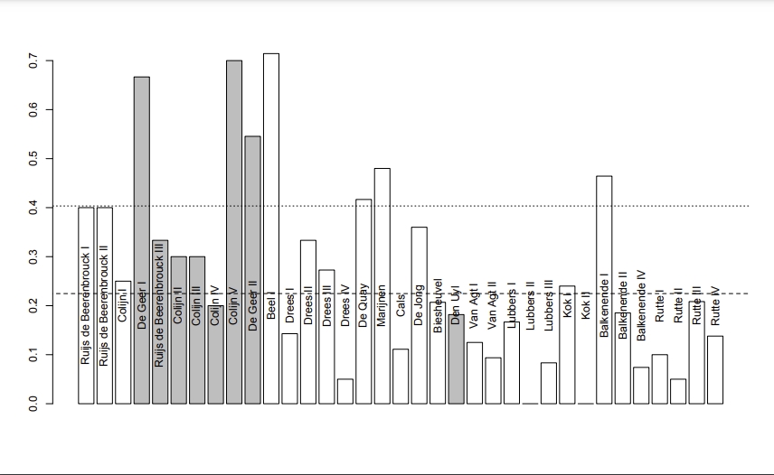 Figuur 2: Aandeel bewindspersonen dat voor aanvang van het kabinet geen politieke functie had. Witte balken: parlementaire kabinetten. Grijze balken: extraparlementaire kabinetten.