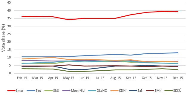 Een ongekende consensus door het hele politieke spectrum van Slowakije heen, is er te zien op het vlak van de vluchtelingencrisis. Praktisch alle partijen zijn uitermate kritisch over de huidige opstelling van de Europese Unie. Premier Fico vocht, naar verluidt om het electoraat te paaien, de herverdeling van vluchtelingen aan bij het Hof van Justitie van de EU. Zoals duidelijk wordt uit bovenstaande grafiek, is de vluchtelingencrisis een zegen geweest voor de Smer. De populariteit liep terug in de zomer van 2015, maar een strijdvaardige houding tegenover de EU en stevige anti-moslimretoriek hebben de peilingen weer opgekrikt.
