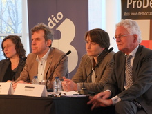 v.l.n.r.: : Conny Broeyer, Biba Schoenmaker, Theo Coskun en Fleur de Beaufort. De debatleiders zijn Kars Veiling en Roos Wouters.